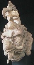 An almost intact sculpture face with on top a bird catching a fish